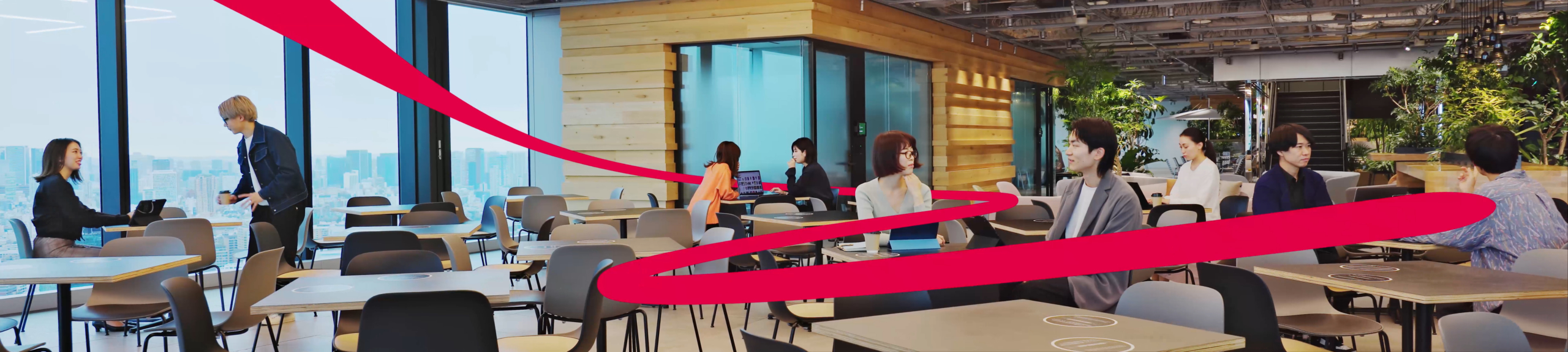 リニューアルされたコーポレートロゴに配置された「熱狂、興奮=熱いつながり」を表す「レッド」と「心地よさ、あたたかな気持ち=温かいつながり」を表す「オレンジ」のラインが、6種類のアニメーションで表現された世界を気持ちよく駆け抜け、最後にMIXIのオフィスに辿りつきます。